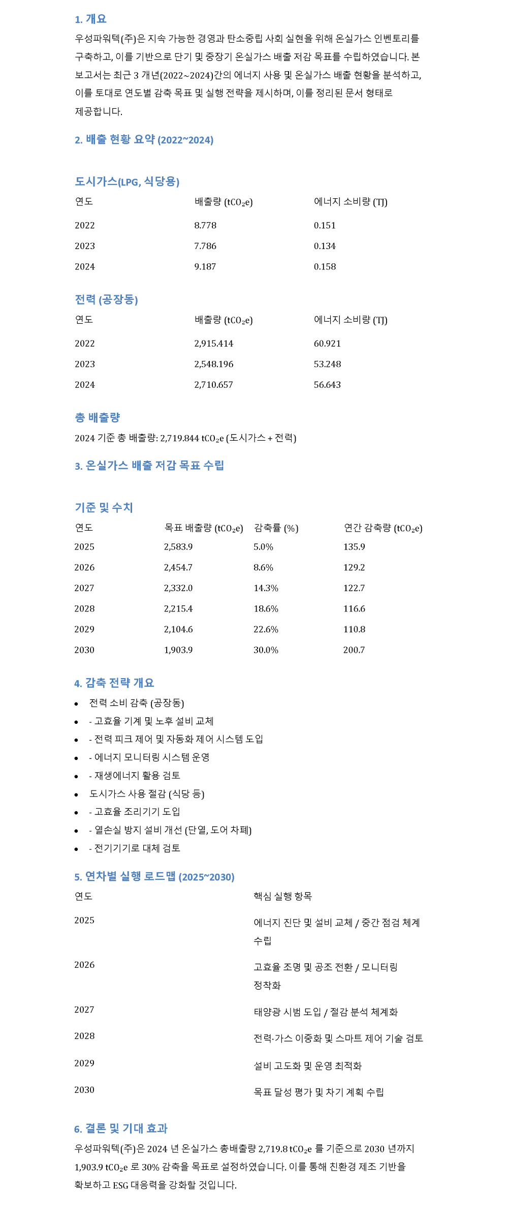 우성파워텍(주)는 에너지 소비 효율을 높이고 온실가스 배출을 저감하기 위한 지속가능경영의 일환으로, 2030년까지 사업장 내 태양광 발전 설비를 단계적으로 도입할 계획입니다. 이는 화석연료 중심의 전력 소비를 줄이고, 재생에너지 비중을 확대함으로써 기후변화 대응과 탄소중립 목표에 기여하고자 하는 노력의 일환입니다. 당사는 친환경 에너지 전환을 통해 ESG 환경경영 체계를 강화하고, 에너지 자립도 향상 및 장기적 비용 절감 효과를 동시에 도모할 예정입니다.